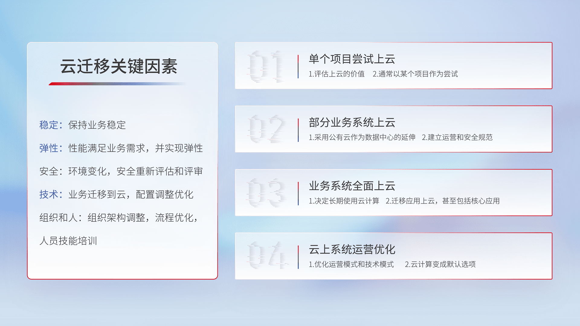 结合实际业务,,,,从规划设计、、、、云平台选型、、、云原生改造、、数据迁移、、、集成交付,,迁移全过程为客户识别最佳上云路径,,,,做好风险识别管理,,设计网络架构、、、、身份权限、、安全审计合规、、操作审计、、、、日志审计、、、、监控告警策略、、、、多站点容灾设计等,,,对云上基础设施进行整体规划,,提升IT治理水平,,以满足弹性、、、高可用、、高性能的需求。。。。