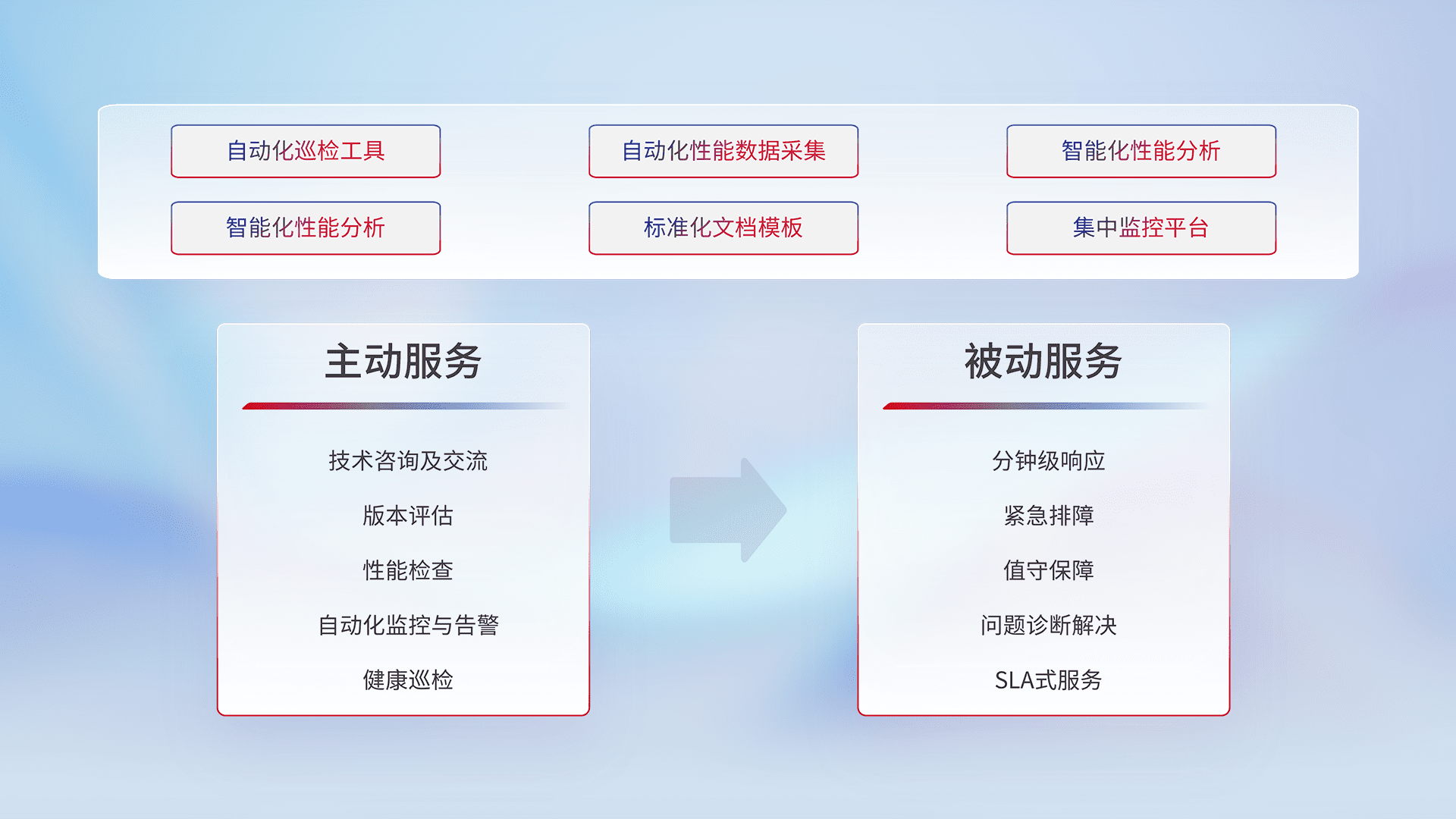 智能化工具和标准化文档,,保障服务质量,,,提供主动服务(包含技术咨询、、、、版本评估、、、性能检查、、自动化监控与告警、、、健康巡检)和被动服务包含(分钟级响应、、、、紧急排障、、、值守保障、、、问题诊断解决、、、、SLA服务)。。。
